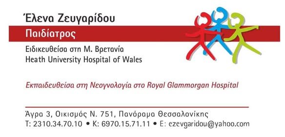 Η Ένωσή μας, με ιδιαίτερη χαρά ανακοινώνει την συνεργασία της με την Παιδίατρο κ. Έλενα Ζευγαρίδου, το ιατρείο της οποίας βρίσκεται στο Πανόραμα Θεσσαλονίκης επί της οδού Άγρα 3 με τηλέφωνο επικοινωνίας 2310347010.
